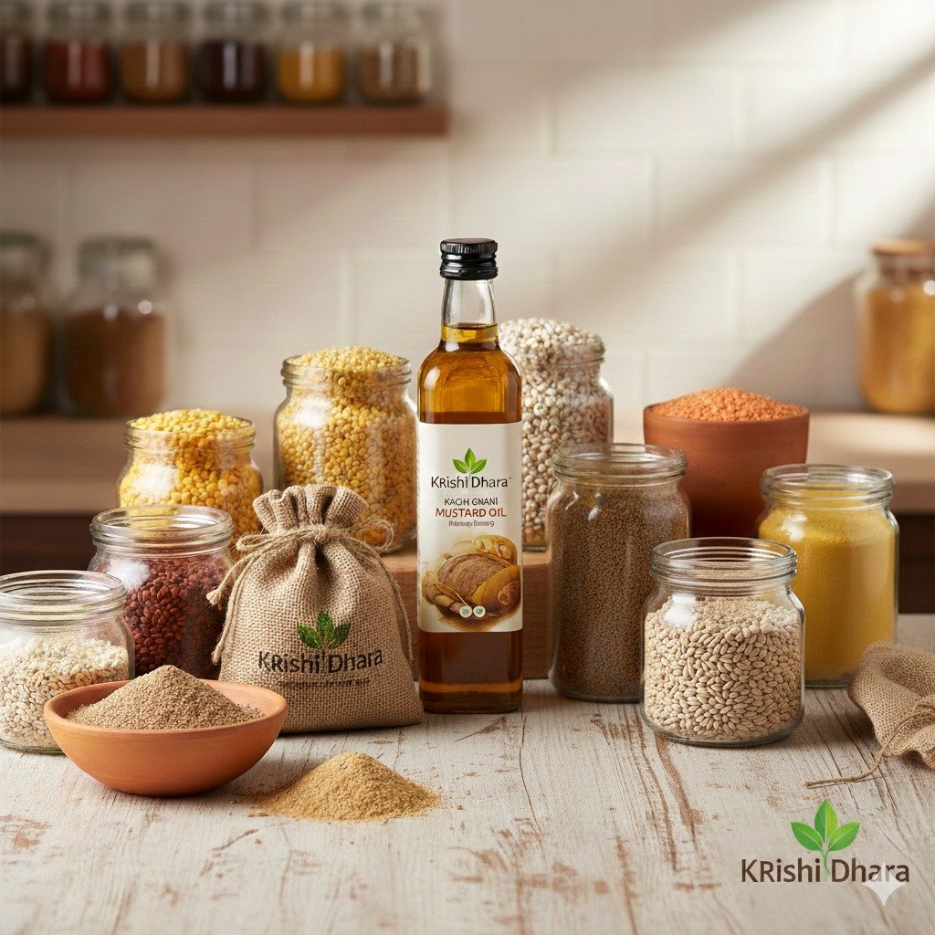 • The Krishi Dhara Solution: We provide authentic, wood-pressed (Kachi Ghani) oils, including our signature Pure Mustard Oil.